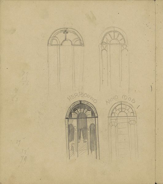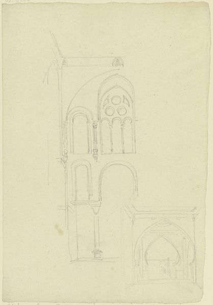 Curator: Before us is Karl Ballenberger's "Gothic Portal," a drawing residing here at the Städel Museum. It presents an architectural study, focused intently on form. Editor: Immediately, I'm struck by the delicacy of line. It’s almost ephemeral, like a ghostly imprint of monumental architecture rendered with quiet reverence using paper and drawing tools. Curator: Exactly. Let’s consider how the artist's focus isn't necessarily on capturing a specific structure, but on exploring geometric principles of Gothic design and spatial configurations that defined much of religious ideology at the time. The very notion of height was an expression of the Divine's domain. Editor: I see that clearly in the repeated arches, drawing the eye upward to where the structure almost fades at the very top. We can’t forget that drawings like this weren't always simply sketches. They are crucial documents of labor. Did Ballenberger consider how craft shapes identity? How architectural choices themselves reinforced gender or class distinctions in the communities for which such monuments were conceived? Curator: An incisive observation. These portals mediated access, reinforcing social hierarchies and regulating the flow of bodies and ideas within a structured religious context. This portal as depicted here could very well underscore access or a barrier according to religious laws. Editor: Thinking about the physical act of drawing, too, interests me here. The paper, the artist's hand. Even if the drawing remains detached, as a historical fragment, its presence raises vital questions about labor—Ballenberger's, certainly, but also that of the stonemasons who labored in precarity for such heights of artistic and social dominance. Curator: I agree, it prompts consideration of these artisans' contributions—often sidelined or deemed 'anonymous.' Re-evaluating historical accounts using this sketch urges an approach towards the agency and identity-building of said laborers as stakeholders through acts of material production. Editor: This architectural detail reveals not just geometric structures or an aesthetic system, but an entire ecology of making—social, material, historical, with all the uneven distributions of power at play. It asks how meaning itself accrues via the combined efforts of making and the act of representation. Curator: Indeed, our analysis encourages us to understand the artwork, its creator and subsequent beholders as complex players who contribute to societal discourse surrounding not just religion, but every possible identity marker connected therein. Editor: And for me, reflecting on the materials and the process grounds those complexities—revealing Gothic ambition as profoundly shaped by earthly conditions of labor, as we see translated in line and architectural shape within this subtle study.