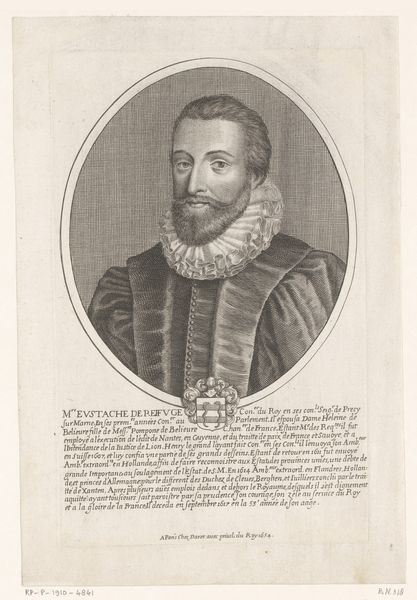 Curator: The gaze here is remarkable, almost piercing, don't you think? Editor: It does project a certain intensity. Formally, the strong chiaroscuro heightens the sense of drama and introspection. Are we looking at a painting? Curator: It's a print. This is "Portret van Petrus Cunaeus", made sometime between 1667 and 1720 by Johann Christoph Boecklin. Found in the Rijksmuseum's collection, this engraving captures its subject, well...in sharp detail. Editor: The tight, linear hatching does create that sense of detail, almost photographic in its precision despite being pre-photography. What I'm drawn to, though, is how the ruffled collar encircles the head like a halo, paradoxically emphasizing the sitter's grounded presence through contrast. It’s like the weight of thought materialized as ornate fabric. Curator: You know, seeing it that way—like thoughts made tangible—makes me reconsider my initial feeling of a stern, academic portrait. There's something very tender about the light falling on his face, highlighting the tiny imperfections around the eyes. It's less about the historical figure, more about the intimate experience of being human. Editor: The composition, too, is notable. The portrait's rectangular frame contains the subject, but the lines of the cloak and the internal shading create movement within that space. Boecklin directs the eye upward, making the face and the gaze central to the viewing experience, and I think in this way challenges the static nature that you might anticipate with portraits like this. Curator: And the Dutch Golden Age certainly left its mark, eh? Boecklin doesn't just give us a man but an interior landscape too. I appreciate now, revisiting my first impressions, that his skill makes us want to understand him deeply. Editor: I agree. Close viewing transforms it. What initially struck me as a formal depiction now seems remarkably personal. The engraving is a compelling study in human presence as seen through skillful interpretation of light and shadow.