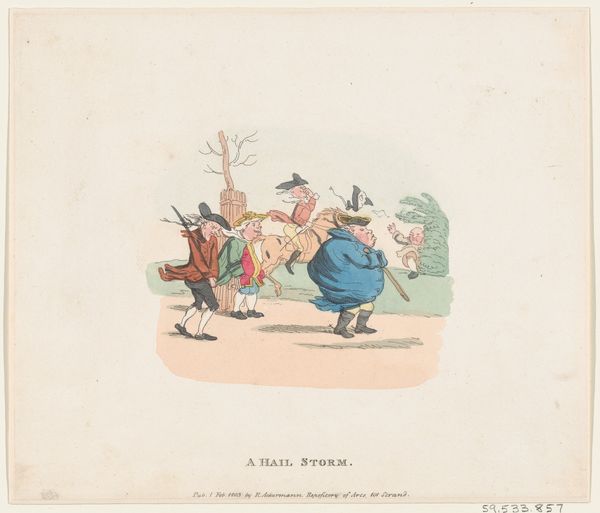 This print, “A Hail Storm”, was made by Henry William Bunbury sometime in the late 18th century, using etching and hand coloring. Bunbury was an amateur artist, producing caricatures and satirical prints like this one, which were then replicated and widely distributed. Here, the etching process allows for a sharp, linear style, ideal for caricature, and gives a sense of immediacy. The hand-coloring adds another layer of detail, subtly enhancing the drama of the scene. The commercial print-making industry in 18th century Europe enabled artists to create multiple originals, democratizing access to art. Look closely, and you will see that the figures, caught in a storm, are rendered with exaggerated expressions and postures, inviting viewers to laugh at their misfortune. “A Hail Storm” captures a moment in time, transforming a natural event into a scene of social satire, speaking to the era's burgeoning consumer culture and the accessibility of art to a broader audience.