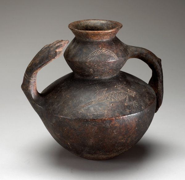 Editor: Standing before us is this captivating ceramic long-necked jar, crafted around the 5th century. Its earthenware body exudes a quiet simplicity. To me, there's a sense of profound stillness, almost meditative. What story do you think this vessel whispers? Curator: Ah, whispers... I love that. It makes me wonder about all it might have held! Beyond function, ancient vessels such as these, though humble at first glance, remind me that, for a culture, utilitarian *is* beautiful. Notice the rhythmic incised lines, each imperfect little zigzag hinting at the maker's hand, each a subtle prayer for a plentiful yield perhaps? Don't you find these slight imperfections to be, counterintuitively, the loveliest element of all? Editor: Absolutely. It’s interesting how the imperfections add to its charm, rather than detract from it. They ground it somehow. Thinking about that zigzag pattern again – were similar decorative patterns common during this period? Curator: Precisely! And indeed, these patterns weren't merely decorative. Think of the ancient potter as philosopher. See how the circle repeats and coils around? Everything loops, beginningless and endless; it is an essential symbol. What feelings do those eternal loops ignite within you? Editor: Hmm, endless cycles. Hope maybe? Curator: Perhaps it's all a big joke... But indeed, like your “stillness” or “hope”, there's that sense of quiet endurance, that slow, turning, and ancient kind of persistence, isn't there? So, perhaps, this vessel also holds more abstractly the human heart itself? Editor: Yes, I see it. Looking at it now, it speaks less of perfect function and more of lasting humanity. Thanks! Curator: My pleasure!