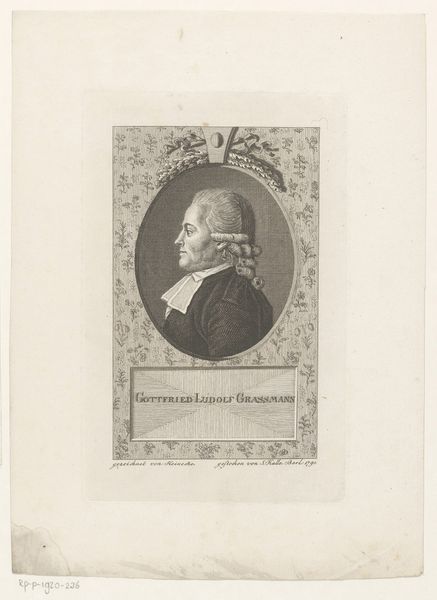 This engraving depicts Karl Wilhelm Hennert, likely made in the late 18th century by J.S.L. Halle. It encapsulates the visual language of power and status in that era. The image is framed by military objects that represent the status of the sitter. The oval frame is surmounted by a laurel wreath, which is a classical allusion to civic or military triumph. Made in the Prussian States, this portrait encapsulates the social order of the time. Prussia's military prowess defined much of its political and social life. Aristocrats dominated the officer corps. Images like this reinforced a rigid hierarchy and affirmed conservative values. The artwork serves as a historical document that reflects not just individual likeness, but the socio-political climate of its time. Historians can explore sources such as military records and genealogical data to understand the sitter, artist, and the work's cultural impact. By examining the image’s social and institutional contexts, we can explore its rich layers of meaning.
