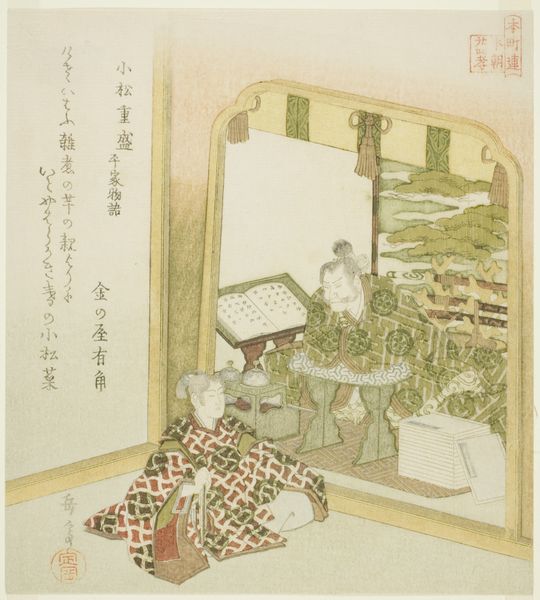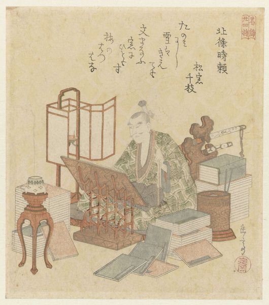 Yashima Gakutei created this print depicting Komatsu Shigemori from the Tales of Heike, using woodblock printing, a quintessential technique of the Edo period in Japan. The process begins with a drawing, then meticulously carved onto woodblocks—one for each color. The blocks are then inked and pressed onto paper, layering colors to create the final image. Notice how each element is sharply delineated, a testament to the skill of the printmaker. The flat planes of color and the distinct outlines are not just aesthetic choices; they are direct results of this labor-intensive method. The social context here is also important: woodblock prints made art accessible, connecting the broader public to narratives like the Tales of Heike. The making is integral to its meaning. It's a powerful reminder that art is not just about the final image but also the processes and social frameworks that bring it into being.