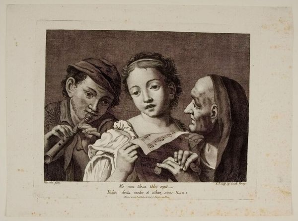 Editor: Here we have Wallerant Vaillant's "The Artist's Family". It's a monochrome print, and I am struck by the composition, how the figures are arranged. What do you see in its visual structure? Curator: Note the strong diagonals created by the gazes and gestures, which leads the eye across the picture plane. The subtle gradation of tones, achieved through mezzotint, creates a unified visual field. How does the artist manage to give depth to the work? Editor: Through the strategic use of light and shadow, the artist creates a sense of three-dimensionality. I initially missed that effect! Curator: Exactly! The balance between light and dark areas provides visual interest and defines the forms. I'd say it is a successful study of light, tone, and texture.