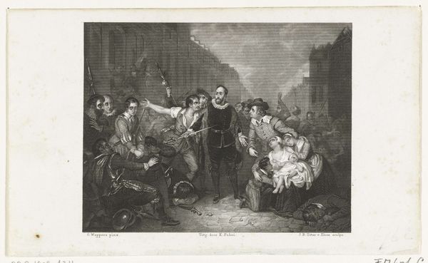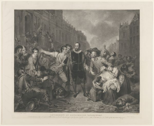 Curator: Before us we have "The Death of Major Francis Pierson" created by James Heath around 1796, an engraving. Its complex composition really catches the eye. Editor: It does! I'm struck by the dynamism. The artist has really captured a moment of chaos and heightened emotion through dramatic use of light and shadow. Curator: Heath’s work, echoing Copley's dramatic history painting, portrays the historical event in Jersey in 1781 during the French invasion, when the young Major Pierson was killed while leading the British to victory. Note how the figures are arranged almost like a stage play. Editor: Indeed. There’s a theatrical quality. Consider how the central figure of Major Pierson, struck down yet defiant, echoes classical depictions of heroism. His stance, surrounded by action, anchors the visual narrative. The faces of those nearby range from shock to determination. The Black soldier taking charge. Curator: It's interesting you mention that the heroic Black soldier leads onward immediately after Pierson is killed. In many ways this print tries to cement a view of the colonial history by emphasizing not just valor and duty, but crucially loyalty, while in actuality there were constant slave rebellions occurring during the period throughout all of the British colonies, including Jamaica. Editor: So the artwork aims for more than mere visual representation; it strives to convey specific political and moral values prevalent during its time, through strategic compositional choices. Look at the buildings on either side "framing" the scene while smoke adds drama but somewhat blurs details that don't fit the narrative, heightening the focus. Curator: This "blurring" is no doubt intended to idealize what was obviously an incredibly fraught historical period. It's a deliberate sanitization through romanticized symbols of valor. That brave child. The mourning figures on the right are visual symbols meant to move and sway popular opinion. Editor: Fascinating. Analyzing the print's symbolic weight gives insight into the artist's choices and intentions. Curator: A reminder that images have long been imbued with cultural and political force! Editor: Yes, beyond aesthetic preferences, there are choices and strategies at work that shape the artwork's cultural influence.