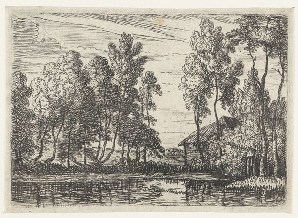 This drawing, "Trees by a Body of Water" by Franz Kobell, presents a landscape rendered with delicate strokes of ink on paper. The scene is dominated by a cluster of trees reflected in the water, their forms dissolving into the shimmering surface. The artist uses line in varying densities to define shape and texture, creating a tapestry of dark and light. Kobell’s technique emphasizes the structural elements of the landscape. The composition is built on a series of contrasts: the solid forms of the trees against the fluid reflections, the detailed foliage against the open sky. These elements are not merely representations but become the very substance of the artwork, inviting us to consider the interplay between reality and perception. The cross-hatching and varied line weights articulate the material qualities and the natural textures of the trees and water. This drawing uses formal language to explore the dynamic interplay between nature and art, reality and representation.