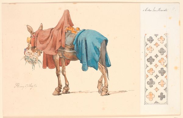 Curator: Ah, look at this watercolor by John Frederick Lewis, aptly titled "Two Camels," created around 1843. Something about it feels very… still. Editor: Still? I find it strangely energetic, almost fleeting. Like Lewis captured these creatures mid-stride but with a contemplative essence, perhaps even exhausted. It's unfinished, the sketchy strokes against the sand-colored paper create that illusion of motion, I think. Curator: Yes, unfinished is a perfect word. The negative space almost highlights the tangible reality of these animals – especially that intricate saddle on the lead camel, overflowing with cultural richness, juxtaposed against the minimalist desert landscape. But do you find the rendering of the saddles more representational than real? It almost speaks to the story it carries beyond utility. Editor: The saddle acts as a mobile cultural icon! From its ornate textiles and embellishments, a silent visual echo of histories, migrations, and traditions across the sands of time. It’s heavier than it looks. The patterns tell tales even the camel cannot. Lewis knew it would take far more effort to depict its exact texture in real life, but in spirit, I'd imagine he would agree. Curator: So true. Camels themselves become symbolic—nomadic existence, resilience, perhaps even stubbornness? Editor: Definitely! In ancient trade routes, camels embodied reliability. The camel itself could signify adaptability. These camels don't appear weighted, burdened, but as individuals on their path, or the promise of movement itself, even to the end. Curator: I love how the softness of watercolor brings out a very tangible animalism from these travelers, and the minimal landscape surrounding them lends a sense of timelessness and vulnerability. Editor: A balance between concrete existence and our interpretation. So that both complement each other beyond utility. We're only human to give symbols deeper, more relevant personal meaning! Curator: Absolutely, and thank you, as always, for giving "Two Camels" another journey, but of self-reflection! Editor: With every cultural symbol, the self gazes back. Until next time!