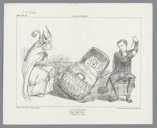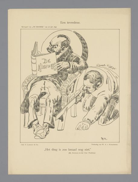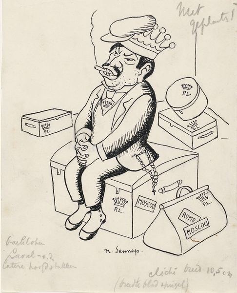 Curator: Looking at this intriguing piece by Herbert Lawrence Block, created in 1957, it appears to be a drawing using pencil and pen. Its title, "Look Lady - You Don't See Me Worrying", immediately sets a cynical tone, doesn't it? Editor: Absolutely, there’s a sense of blithe detachment. The composition centers around an oversized, vaguely humanoid figure. Its sheer mass and disproportion compared to the smaller figures—some everyday people?--around it definitely projects power and apathy. Curator: Right. And if we consider the context of 1957, the Cold War was very much underway. This artwork operates as a critique of the military-industrial complex and its disregard for the working class. Look at the Atomic Energy Commission official and the image of the person casually bouncing through ‘Nuclear Fallout Danger’… Editor: Yes, it really drives the point home by underscoring the idea that the lives affected are considered irrelevant within these machinations of power and development of technological resources. You also sense the material cost and environmental implications – the very literal waste being produced. Curator: Block worked for the Washington Post, providing political cartoons and social commentary, reflecting anxieties around atomic weapons testing and Cold War policy. We can imagine his production methods involving quite rapid execution to respond quickly to evolving geopolitical circumstances. Editor: It is powerful how it speaks across time, isn't it? The subject matter still resonates with themes of environmental irresponsibility and exploitation. It begs questions around accountability that remain deeply relevant today. Curator: Considering the immediate production and the urgency of the medium, you understand the vital role played by cartoons and political satire as instruments to prompt critical examination. Editor: This exercise in free, democratic, and accessible cultural critique underscores how artistic interpretation might provoke introspection around the construction and consumption of both natural resources and media narratives. Curator: A thought-provoking commentary on indifference towards everyday labor! Editor: Indeed. A poignant lens for evaluating present power structures.