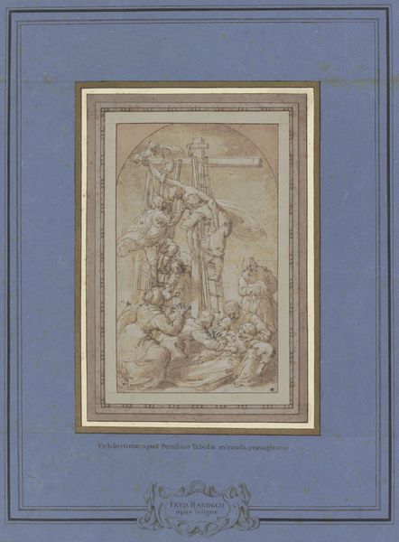 Vincenzo Danti made this drawing, *Drei Putten mit Schrifttafeln*, using pen and brown ink. It shows three cherubic figures holding tablets, their bodies rendered with rapid, energetic strokes. The material itself—paper and ink—is quite humble. Yet, Danti coaxes a wealth of expression from it. Notice how the pen lines vary in thickness, creating a sense of depth and shadow. The quick, almost frantic marks give the figures a sense of vitality. This wasn't just sketching; it's about capturing the energy of his sculptural ideas on paper. The drawing mimics sculpture: Danti was a sculptor by trade, more familiar with stone, bronze, and clay than paper. This drawing can be viewed as part of the wider cultural shift taking place during the Renaissance, a time where the status of art and the artist was shifting and draftsmen became increasingly popular. Drawings such as this challenge the traditional hierarchy between fine art and craft. It is both a preparatory sketch and a work of art in its own right.