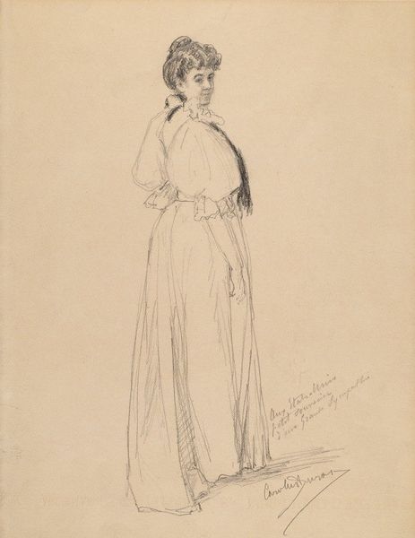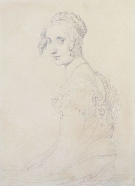 Curator: We’re looking at a pencil drawing by Jean Auguste Dominique Ingres, dating back to 1843. It's titled "Madame Armand Bertin, née Marie-Anne-Cécile Dollfuss." Editor: It's ethereal, almost faded, like a half-remembered dream. The precision is startling given the apparent delicacy of the medium. I’m immediately drawn to the material itself and the way light seems to slip across the paper. Curator: The lightness you perceive is characteristic of Ingres' neoclassicism, a conscious revival of classical ideals. Notice the meticulous detailing of Madame Bertin's dress, especially around the collar. It symbolizes refinement and status. Editor: Status, definitely. The sheer volume of fabric is suggestive of wealth, all these precisely rendered, light lines implying skilled labor dedicated to its manufacture and her elevated consumption. You can sense the texture, the weight, through Ingres’ careful hatching. Curator: And consider her pose. There’s a vulnerability in her averted gaze and clasped hands, yet an undeniable self-assurance. The tight curls framing her face soften the overall impression, introducing an element of fashionable romanticism, but contained, restrained. Editor: Right, because those ringlets feel rigidly controlled; it’s artifice, just as much labor went into styling them, holding them in that fixed, unwavering state. There's something potent in understanding how social position and self-presentation are quite literally constructed here, right on the page, through pencil marks and countless hours. Curator: Absolutely. The portrait serves not just as a likeness but as an iconographic representation of bourgeois virtue. She becomes a symbol for her time, mirroring certain qualities. Editor: I find it compelling how the apparent simplicity of the materials – pencil and paper – belies the complex social machinery at play. What looks understated actually reveals a wealth of production and cultural values. Curator: It's a powerful testament to the enduring dialogue between form, material, and the symbols they convey, a delicate interplay that continues to resonate with us today. Editor: Exactly, looking closer, we see that every single mark, every single pencil line, is a conscious decision loaded with implications beyond mere representation.
