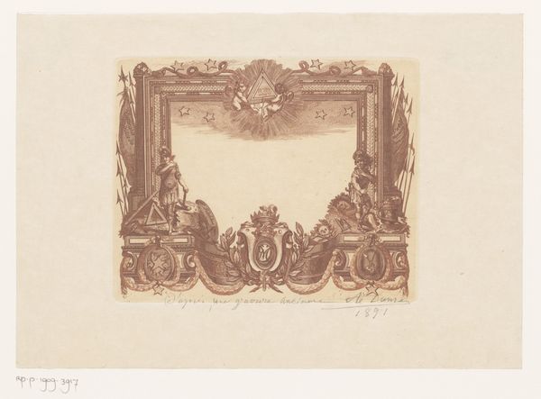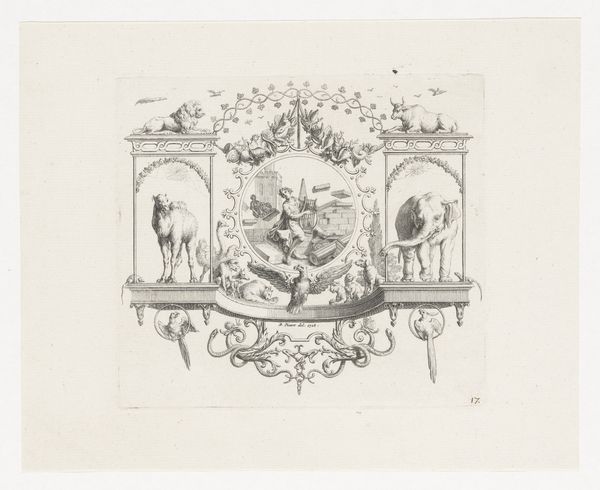 Curator: This delightful little print is "Liefdespaar in tuin," or "Couple in a Garden," by Bernard Picart, dating back to 1728. Editor: Intimate. That’s the word that leaps to mind. The baroque frame feels intentionally ornate, as if setting the scene for a forbidden rendezvous, what do you make of that framing choice? Curator: Absolutely, it is rather inviting. It is like peeking through a keyhole, almost voyeuristic. The formal garden and embracing figures draw you in immediately; the garden architecture suggests control, contrasting the unconstrained embrace of the figures. Editor: A delicious contradiction, hinting at power structures through garden design but challenging those norms with figures flaunting their intimacy, it is political theatre. How can a moment of tenderness exist amidst systems designed to oppress such impulses? Curator: Yes! The placement within the print seems like a conscious juxtaposition, reflecting society's conflicted views on love, freedom, and maybe the simple human desire for closeness. The border with cherubs is the best; a visual pun or a subtle social jab! Editor: Perhaps Picart encourages a revolution of tenderness, reclaiming space for marginalised affections, using symbolism and composition to confront the artifice of morality and its function in service of class and control. That period witnessed tumultuous socio-economic upheaval with the emergence of new social orders and challenges to the status quo. Do you think Picart was conscious of those challenges? Curator: The Baroque flourish does seem to suggest that this intimacy is not easily attainable for all; but more specifically for this demographic in their situation and standing. Looking back at the work now, it’s so lovely to see it anew. It's made me consider that while social struggles remain real, it’s the intimate and tender moments between us that define and shape our own individual resistance. Editor: Indeed, from revolution to garden, and back again—such potent whispers in lines etched on copper. Thanks to Picart’s careful engraving technique, his visual declarations remain timeless!