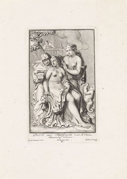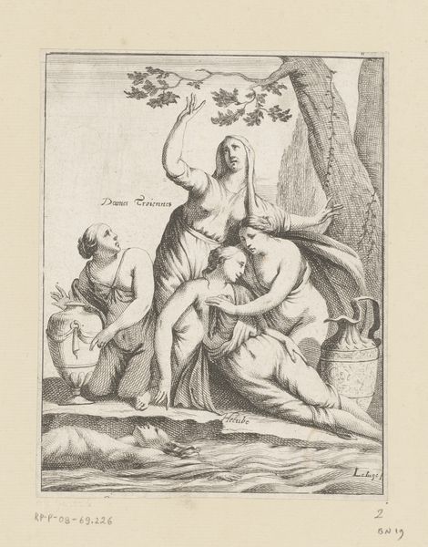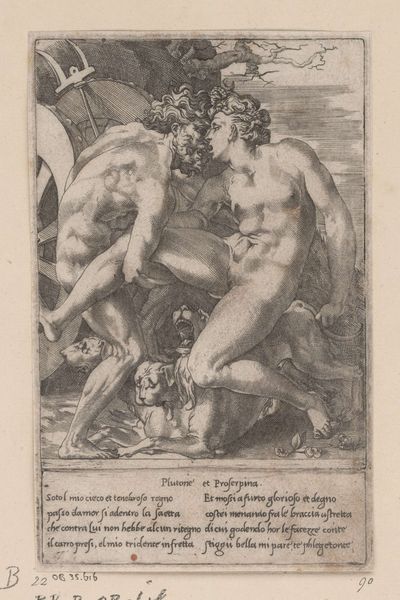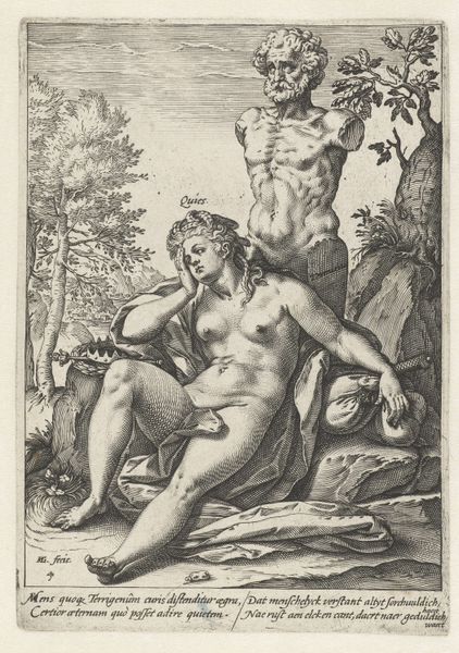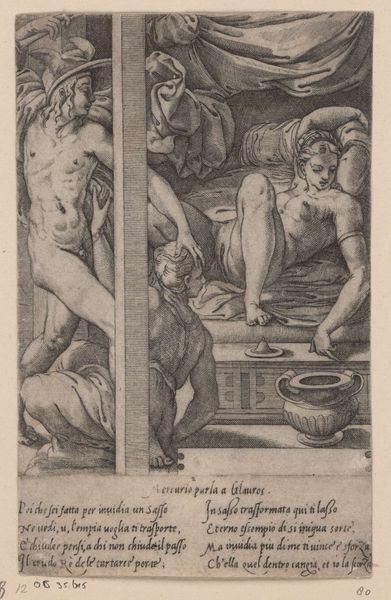 Willem Panneels created this etching, Jupiter en Antiope, in the 17th century. The print plunges us into a chiaroscuro world, a dark, contrasting space where the figures emerge dramatically from the shadows. The artist's use of line is striking, varying from delicate, thin strokes to bold, emphatic marks that define form and create depth. The composition is dynamic, with the diagonal line of Antiope's reclining body creating a sense of movement. This, coupled with the watchful Jupiter, draws the viewer's eye around the scene. The texture, achieved through intricate crosshatching, gives a tactile quality to the figures and landscape, enhancing the sense of drama and unfolding narrative. Panneels uses the visual language of the era to explore themes of power and vulnerability. This piece invites us to consider how the artist uses form and structure to engage with, and perhaps challenge, the established codes of representation of his time.