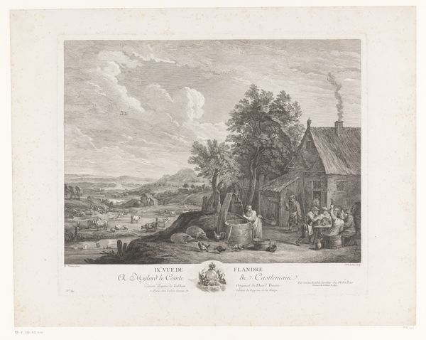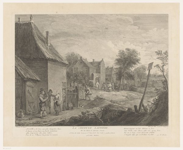 Curator: Welcome, everyone. Let's turn our attention to "Kegelspelers voor een huis," or "Bowlers Before a House," an engraving dating back to 1743. The artist, Andrew Lawrence, captures a leisurely scene, etched with meticulous detail. Editor: It strikes me immediately as having a theatrical, almost stage-like quality. The figures are arranged with such precision in the foreground. The linear precision really sets the scene; it feels deliberate and balanced. Curator: Absolutely. It's essential to remember the era. The 18th century saw a growing merchant class with increasing access to leisure time. These genre scenes reflect a shift in social dynamics, celebrating everyday life and moments of communal pleasure. Look at how it depicts social relationships; who gets to enjoy this leisure activity? Are there hierarchies being reflected? Editor: I see the perspective receding sharply. The eye is drawn into the space, defined by that interplay of light and shadow. How the architectural elements and the trees guide the viewer is, in my opinion, essential to consider, even with just lines etched into a metal plate. Curator: And the choice of a print—an engraving, no less—speaks to accessibility. It would have been circulated widely, disseminating not only images but also ideas about recreation and social cohesion within the domestic sphere. Think about the taverns as political spaces as well as recreational areas! Editor: True. However, one must not miss the symbolic composition of the etching; see how those vertical bowling pins contrast with the solid horizontality of the architecture? These stark contrasts provide an emotional depth. It hints at some unseen narrative, or an unfolding event of significance. Curator: Precisely! What does it mean to construct a visual culture where this type of scene is worth depicting and reproducing? This piece, to me, provides insight into how power and social values get baked into our seemingly innocuous forms of entertainment. Editor: A fascinating blend of formalism and critical insight, my friend. I find myself seeing anew how structure and socio-political analysis work in unison to shape our understanding. Curator: Agreed. Thank you for illuminating aspects of form while helping to decode the historical dynamics at play. I'll remember those lines when viewing other work.
