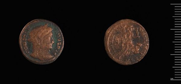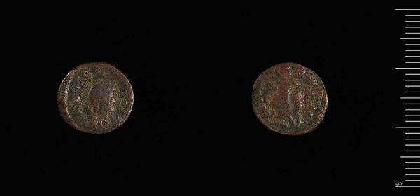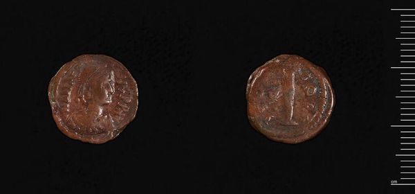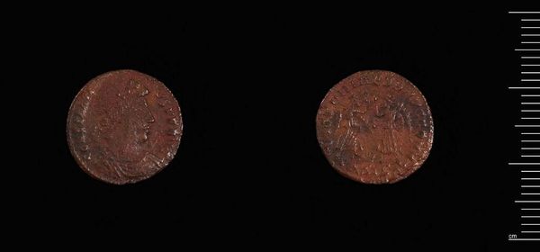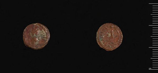 Curator: Looking at this coin, I feel a connection to something ancient, almost dreamlike. Editor: Indeed. This is a coin, designated AE4, minted under the reign of Valentinian II. It resides here at the Harvard Art Museums. Let's contextualize its significance. Curator: It's so small, yet I can almost feel the weight of an empire resting on it. What do you make of the imagery? Editor: The coin speaks volumes about power, legitimacy, and visual propaganda in the late Roman Empire. We see the emperor's image, intentionally crafted to project authority, but also religious symbolism to legitimize his rule. Curator: It's incredible how art, even on such a tiny scale, has always been used to convey messages, manipulate perceptions. Editor: Precisely. Think about the labor, the resources, the socio-political forces at play in its creation, and how we can still engage with that history. Curator: It makes me wonder about the hands it passed through, the stories it could tell. Editor: Absolutely. It's a tangible link to a world that shaped our own. A potent reminder of history.