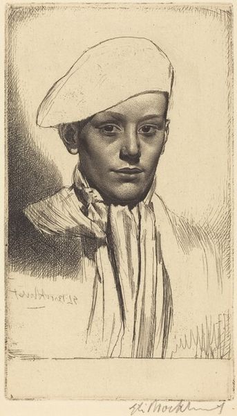 Curator: This is "Gulli II," an etching made in 1918 by Anders Zorn. Editor: There's an intensity in the woman's gaze. The use of shadow makes it feel both intimate and a little haunting, despite the seemingly straightforward portrait style. Curator: Zorn was known for his etchings, achieving remarkable tonal range through cross-hatching and varied line weights. The market at the time celebrated these virtuoso printmaking displays, solidifying Zorn’s status as a sought-after portraitist amongst the European elite. Editor: Looking at the sharp lines around her face, I wonder about the labor involved. Creating such detail by etching would require a precise process. Do we know about the economic situation for printmakers in 1918? Curator: Absolutely, the printmaking boom allowed artists such as Zorn to operate within networks of galleries that showed and distributed multiples to ever larger publics, influencing tastes and styles across broad geographies. It created an alternative market outside the formal Salon system. Editor: That access meant something different for the sitter, too, didn’t it? It's fascinating how her clothes become less defined the farther away we look from her face; like material possessions are not the subject of the piece. Curator: Exactly, her almost confrontational gaze gives an egalitarian mood to the piece. Though technically skilled and representative of its time, "Gulli II" reflects an interesting approach for such an in-demand artist; less idealized, more a character study. Editor: This makes me appreciate how Zorn highlights the skill required to transform a metal plate into something so emotionally resonant. You can almost see the manual process, like tool meeting the plate. It elevates it beyond just an image. Curator: Indeed, analyzing "Gulli II" unveils not just Zorn's mastery but the wider industry, public tastes and artist market strategies of early twentieth-century portraiture. Editor: And for me, it's in understanding the physical effort and social context involved in creating a relatively commonplace etching that elevates it, rendering the ordinary beautiful.