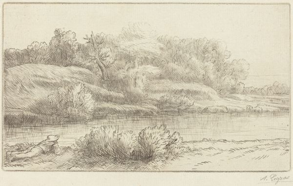Editor: This is John Sell Cotman's "View on the Yare, Norfolk," an etching from the early 19th century. It's a tranquil landscape, but the densely packed trees almost feel claustrophobic. What do you make of this depiction of the English countryside? Curator: Cotman presents a seemingly idyllic scene, yet consider the historical context. Land enclosure acts were displacing rural populations, forcing them into urban poverty. Does this dense, almost suffocating vegetation, hint at the pressures on the land, the lack of space for those displaced? Editor: That's a powerful reading. I hadn't considered the social implications of land use at the time. Curator: The picturesque often obscures the realities of power and dispossession. By framing it this way, we can start to see the landscape as a site of contestation, not just a scene of beauty. Editor: It's amazing how much the context changes the way you look at it. Thanks! Curator: Absolutely, keep questioning the dominant narratives!