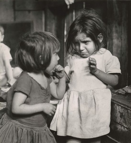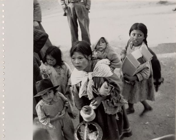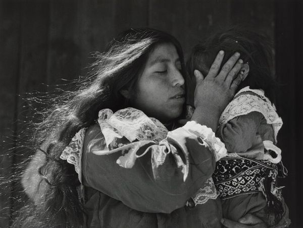Curator: This arresting black and white photograph by Dorothea Lange, entitled "Mexican-American child, San Francisco," dates back to 1928. Editor: Immediately, her direct gaze is so captivating. There’s an openness and innocence, but also something quite sobering about those big eyes in black and white. It reminds me of portraits from the Depression era, a sense of vulnerability and resilience all at once. Curator: You're right to notice that connection. Lange's photography often sought to document the human condition, particularly marginalized communities. Here, even without explicit contextual clues, her visual language focuses our attention on the specific experience of a child, embedding this individual within a broader cultural history. It really foreshadows her later work during the Depression. Editor: And placing it in San Francisco, particularly 1928, adds a powerful layer. This was a time of increasing anti-immigrant sentiment. That straightforward gaze reads to me almost like a confrontation – an assertion of presence, identity, and belonging in a society that might seek to deny it. I see not just a child, but a young person staking a claim to her space and identity. Curator: Her expression transcends the immediacy of the photograph itself and speaks to something timeless: the enduring legacy of migration and the struggles for cultural identity, especially for children who often navigate complex cultural landscapes. Her clothing and that cloth—are they hand-me-downs? It seems they bear a coded symbolism reflecting economic realities and cultural pride. Editor: Absolutely. And the contrast between her denim shirt, and what looks like a carefully maintained white cloth across her chest—the bright whiteness draws attention and signals the importance of purity. That small detail can signal something very important, despite being mundane. Curator: It is like looking into a mirror reflecting both past struggles and future aspirations. In this intimate portrait, a dialogue across generations becomes possible, encouraging all viewers to remember. Editor: Yes, a child's gaze—simultaneously innocent and knowing—serving as a poignant reminder of the complexities of belonging and identity. The photograph’s beauty lies in the dignity it confers upon its young subject.