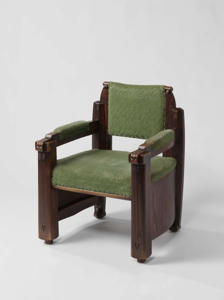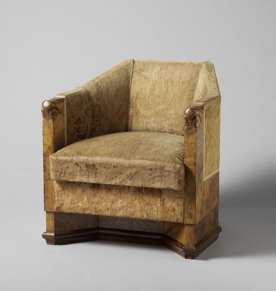 This low-backed armchair was made by Wim Schuhmacher, using wood and patterned textile. Notice the chair’s substantial oak frame, its surface worked to a subtle sheen, and its robust joinery. These details speak to traditional woodworking techniques. Upholstery introduces a softer counterpoint, with its beige fabric patterned with brown diamonds. The fabric itself is a product of mechanized textile production, a contrast to the handmade quality of the frame. Schuhmacher here seems to be harmonizing craft and industry. The chair's design blends clean lines with a comforting, domestic aesthetic. This hints at the social context of its creation: a time of increasing industrialization when designers were actively exploring ways to integrate machine production with human comfort. Considering this piece, it’s clear that understanding the materials and processes used is key to appreciating its broader cultural significance. This approach challenges the divide between ‘art’ and ‘craft,’ urging us to recognize the value and meaning embedded in all forms of making.