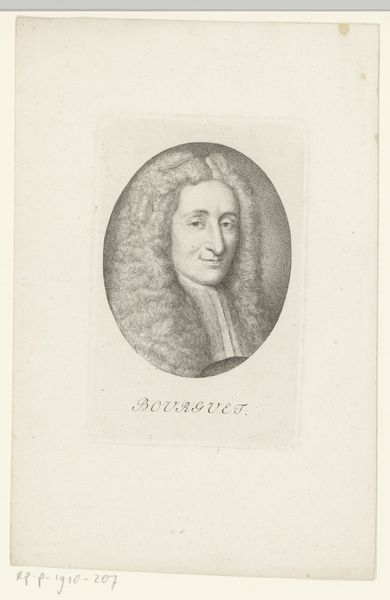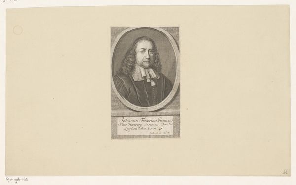 Curator: This is a portrait of Johann Jakob Stokar, an engraving dating to between 1759 and 1815, created by Heinrich Pfenninger. Editor: It strikes me as a portrait exuding serious authority, almost severe, though softened slightly by the detailed, curling wig. Curator: Absolutely. Pfenninger created this print, and it is intriguing to think about who Stokar was, the role he played within society and how the politics of the time influenced its presentation. His gaze is very direct. What does that imply to you? Editor: It feels very performative, I see him presenting his status intentionally through this carefully crafted image. His collar and the medal displayed assert class and power in a world increasingly grappling with identity. Does the history tell us anything about the context surrounding its creation and circulation? Was he a public figure or within what power structures did he circulate? Curator: Exactly the right questions. During this era, print portraits served as key mechanisms for solidifying public image and disseminating power structures. Looking into Stokar's legacy through modern lens is something of vital significance. Considering how the act of representation plays into identity constructs is what intrigues me here, given he lived through revolutionary changes that altered what it meant to hold certain privileges. Editor: The print, by making him widely accessible also democratises him, so to speak, which I'm certain must have carried weight given the social and political climate of the day. Thank you for laying out such complex context so concisely. It allows one to appreciate what's represented but also why and to what end. Curator: My pleasure, examining how we use the visual to negotiate who we are as individuals is where it all begins.