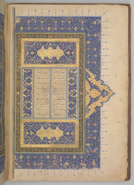 Curator: This illuminated page comes from the Koran, dating back to around the 12th century. It resides here at the Minneapolis Institute of Art. I’m immediately struck by the dense patterning. What captures your attention? Editor: For me, it’s the interplay between the stark geometry of the Kufic script and the flowing, almost organic, ornamentation surrounding it. There's a kind of controlled energy in the composition. You get a sense of both structure and freedom coexisting. Curator: Absolutely. Thinking about the materials used – primarily ink on parchment – it's a testament to the skill and the labor involved in creating such a piece. Preparing the parchment, mixing the inks from natural pigments, the painstaking process of calligraphy itself. It represents an enormous amount of effort and a kind of devotion. Editor: And when we consider the social context, this page wouldn't have been just an aesthetic object; it was a vital part of religious practice, central to Islamic intellectual and spiritual life. Its production reflects a broader system of patronage and craft guilds that flourished during the medieval period. And while created by individuals it represents more then a sole artisan’s point of view. Curator: Exactly, there's this tension between the individuality of the artist, likely a highly trained calligrapher, and the constraints imposed by tradition and religious doctrine. How would you say the calligraphic style, particularly the angular Kufic script, contributes to the overall meaning of the work? Editor: Well, Kufic script, with its clear, monumental quality, communicates authority and permanence. This particular style connects this piece to its specific era in Islamic intellectual history, especially the use of the red marks that aided in the pronunciation of certain texts. As an artifact, it stands to promote language justice today and honor accessibility of religious material. Curator: It's a powerful example of how material choices and artistic techniques were inextricably linked to cultural and religious values in the medieval Islamic world. This intersection of form and content reveals to modern eyes that the historical value of an object rests also in its artistic execution. Editor: It’s work like this, that makes one recognize the immense labor and skill in material making practices of the era while offering crucial opportunities for interfaith and intercultural discussion. Curator: I agree. Considering its age, the page stands as a testament to the dedication and meticulousness embedded within this work. Editor: Indeed. A reminder of the stories objects tell about belief, skill, and human ingenuity across time.