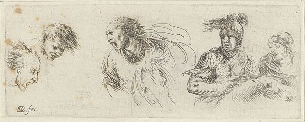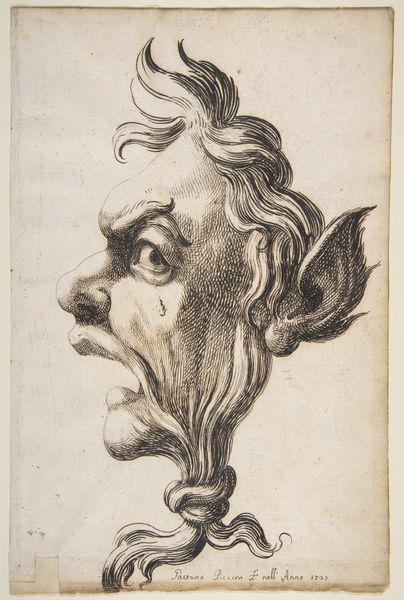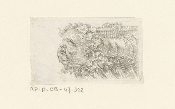 Editor: Here we have "Head of a Child on the Bow of a Ship, from Divers Masques," created sometime between 1630 and 1650 by François Chauveau. It's an engraving, currently residing at the Met. There's something really peculiar about this head. It’s so… bulbous? Almost cartoonish. I'm curious about how one might interpret it. Curator: Peculiar is a perfect word, wouldn't you agree? This image comes from a series for theatrical productions, full of allegory and hidden meaning. Look closely at the details—the leafy crown, the rather puffed-out cheeks— what does it make you think of? Editor: Well, the leaves do suggest some kind of... figure from mythology? Something related to nature? Curator: Perhaps! He evokes the *spirit* of the voyage itself, like a personification of the ship cleaving through the waves. Notice also how Chauveau renders light and shadow with such fine lines, lending the head a surprisingly weighty presence. Editor: I can see that now. It's amazing how much depth he creates with just lines. But a child, really? It looks more like a stout old man! Curator: (Laughs) Age, in art, is but a metaphor. The child could represent potential, the journey ahead, the hopes for the new world—all embodied in this... let's say *unconventional* cherubic form. Think of it as an emotion rendered visible, a guiding spirit heading bravely forward! What do *you* make of its expression? Editor: Hmmm...determination maybe? Or is that just the angle of the nose? I suppose looking at it as a spirit of the voyage makes more sense than just a chubby kid on a boat! Curator: Precisely! See? Sometimes, art demands we look a bit beyond the surface to feel its true, turbulent depths. Editor: Well, I've certainly learned to never judge a face value... or a *visage* value, for that matter. Curator: Indeed. There is something to discover, in every journey.