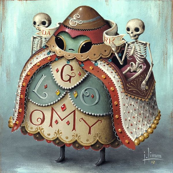 Editor: Jason Limon's "Rascal," created in 2017 with acrylic paint, presents an immediately striking image. It feels almost like a dream, slightly unsettling yet strangely inviting with all these bizarre decorative elements. What is your reading of this whimsical character? Curator: Ah, "Rascal," yes. Limon's work often blends the cute with the slightly macabre, doesn't it? It’s like he's offering us a glimpse into a carnival sideshow in another dimension. The little fellow perched on top with the helmet, peering out with those huge eyes – isn't there something vaguely unsettling about that blank expression juxtaposed with all the embellishment? The patterning feels very intentionally dense. What does it suggest to you? Editor: The patterning to me reads as playful, almost theatrical. The letters, the damask, the jewels - it's a maximalist feast for the eyes. Almost like a bizarre royal decree? Curator: Precisely! It’s decorative art flirting with pop surrealism. And note how Limon anchors it with elements of realism in the cat’s face. The title itself, "Rascal," makes me chuckle. Is this creature mischievous, misunderstood, or perhaps just a touch lost in its ornate getup? I think it speaks volumes. Does it give you any pause that a black cat is hiding just behind this figure? Editor: A bit of both, I think! But, now that you mention it, there’s almost a subtle critique here. It’s beautiful and technically impressive, yet a little... uneasy. As if he is hiding this gorgeous black cat and drawing our attention to the spectacle. Curator: It's definitely food for thought and reflection on beauty. What a delicious dance, right? Editor: Absolutely, Limon really gave me something to chew on. I think the cat looks sad that it's behind such elaborate figure.