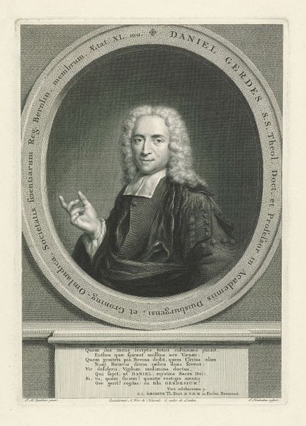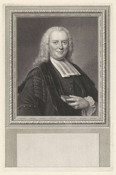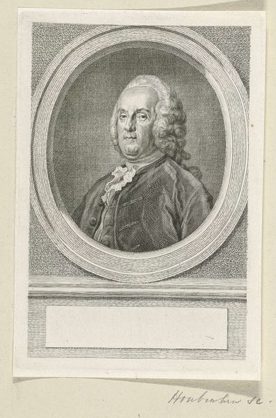 Editor: This is Jacob Houbraken’s engraving, "Portret van Willem van Citters," created sometime between 1757 and 1759. The detail is amazing for an engraving! I'm curious about the process… What's your take on this portrait? Curator: I see an object born from intense labor and the application of specific materials. Engraving, unlike painting, demands a rigorous, almost industrial process. Each line is physically etched into a metal plate, a testament to the engraver's skill and the economics of portraiture in that era. Notice the elaborate frame—more than just decoration, it signifies value and social status both for the sitter and, crucially, for the print's intended consumer. Editor: So you’re saying the *making* of the image reflects something about society then? Curator: Precisely. How might the proliferation of printed portraits democratize image ownership, while simultaneously reinforcing existing class structures? The labour, materials (metal, ink, paper), and the skills necessary dictated who could afford to have and commission these prints, and therefore, whose image would circulate. Is this really democratization? Or another form of consumption? Editor: I never considered the economic side so directly! I was focused on the artistic style, the Baroque influence. Curator: Style isn't divorced from material reality. The Baroque love of ornamentation demanded specialized labor in creating the elaborate frame and even Van Citters' clothing; look at the wig and lace, the materials speak to trade, and a particular social performance. Editor: Thinking about art this way really puts the focus on production and consumption. Curator: Absolutely. Examining art through its materiality reveals a complex network of social relations and economic forces at play. Consider next time who makes art, for what, and out of what stuff.