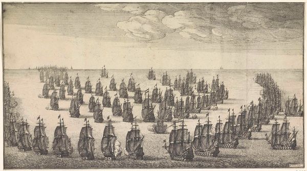 François Chauveau created this print, "Combat de la Louange et de la Satire," using etching, a printmaking technique involving biting lines into a metal plate with acid to hold ink. The controlled, precise lines capture a bird’s-eye view of a battle formation, with opposing forces labeled as virtues and vices. The evenness of the etched lines, requiring both technical skill and physical labor, mirrors the orderly arrangement of troops. Printmaking allowed for multiples of this image to be produced, making it accessible to a wide audience. This print thus acts as a kind of diagram. It is not a depiction of conflict so much as a meditation on moral forces, the ‘combat’ in the title referring more to the kind of social pressure which, in the 17th century, was beginning to replace literal armed struggle. This shift coincided with the rise of early capitalism, where persuasion and ‘good reputation’ are crucial for success. Ultimately, the material and process here are inextricably linked to the artwork’s social context, challenging us to consider the labor, politics, and consumption intertwined with artistic production.