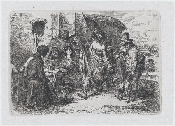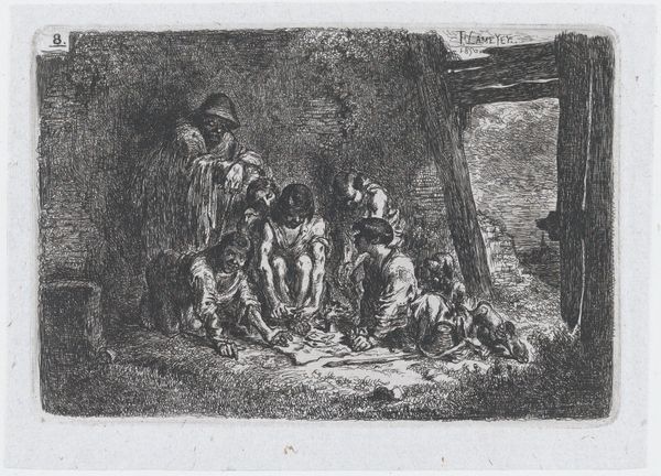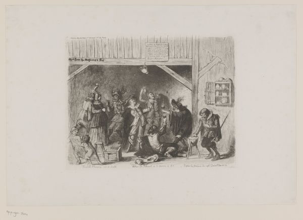 Editor: We're looking at "Plate 4: a street brawl, from the series of customs and pastimes of the Spanish people," an etching by Francisco Lameyer y Berenguer, made around 1850. The first thing that strikes me is the dynamic composition and the chaotic energy; you can almost hear the shouts of the men. What details of this etching do you find most compelling? Curator: The concentration of tonal values in the central brawl creates a powerful focal point. Note how the artist has used cross-hatching to develop shadow and volume. The foreground figure serves to frame and thrust the brawling group further into the viewers space. Editor: I notice the line work is quite detailed, especially on the figures. What does that detail suggest to you about the artist’s approach? Curator: Indeed, the intricate etching technique yields both definition and a degree of realism to the human form, enhancing the overall dramatic effect. Consider the varying line weights; thinner lines describe figures in the background and create depth of space while thicker lines characterize the emotional drama between fighting men. Lameyer utilizes light and shadow contrast, strategically placing his characters into focus for their active engagement. How might one assess Lameyer’s use of perspective in establishing spatial depth? Editor: I suppose the figures are more compressed as they move into the distance to provide a sense of space. Do you think the realism style would accurately depict the subject? Curator: Note how the style employed underscores the work’s commitment to observational accuracy, allowing Lameyer to articulate both the historical specificity of a street fight. The dog and other minute elements surrounding this event serve as secondary features. Did you discover the formal relations to successfully describe conflict, chaos and tension? Editor: Yes, it is intriguing to see how technique shapes our perception. Thank you for the illuminating insights! Curator: An insightful discussion indeed.