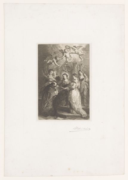 Editor: So, this is "Beeldhouwende aap," or Sculpting Ape, a print made between 1692 and 1734 by Louis Desplaces. It depicts an ape, dressed as a human, carving a bust. I’m struck by the way it portrays labor… I mean, look at this little guy going to work. How would you interpret its commentary on the artistic process? Curator: What strikes me is how this piece interrogates the very *material* of artmaking. Here we see an ape, signifying base, primal urges, seemingly mimicking human artistic labor. But what *is* labor in the context of art? The engraving process itself—the meticulous transfer of image to plate—emphasizes production, challenging the traditional "genius" of the sculptor, don’t you think? Editor: I see what you mean! It’s almost suggesting that art creation is not some divine act, but a constructed process that can be copied, or even, mocked. Is it commenting on who gets to be considered an "artist" and why? Curator: Precisely! The material reality of producing both the print and the sculpture is on display. Think about the social context. Was Desplaces critiquing the Guild system, where artistic skill was meticulously trained and controlled? By equating artmaking with apelike imitation, is he leveling accusations of mindless reproduction against established practices? Editor: So it’s less about the image *of* the ape sculpting, and more about what the print, as a reproducible object, *does*? Curator: Exactly. We should examine how materials, processes, and the socio-economic realities shaped the image’s creation and its reception. Think about it - who could afford this print and how would they view themselves compared to the "aping" artist? Editor: I never considered the social implications of artmaking that way. Thank you. Curator: And thank you for helping me see the process with new eyes.