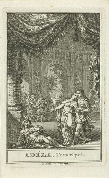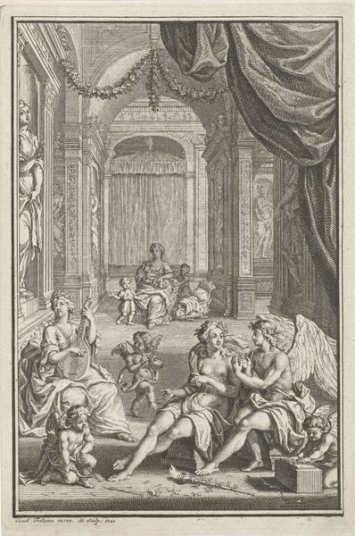 Curator: The scene unfolding before us is a marvel of historical detail, crafted in 1676 by Herman Padtbrugge. It's an engraving entitled "Vasco da Gama op audiëntie bij koning van Calcutta," depicting Vasco da Gama's audience with the King of Calcutta. Editor: My initial sense is one of overwhelming...pattern! Every surface seems to be crawling with intricate designs. The effect, though historically accurate I'm sure, is almost claustrophobic. Curator: I see what you mean, it's an extremely busy composition. Formally speaking, Padtbrugge uses the detailed ornamentation—notice the textiles, the architectural elements—to convey a sense of exotic opulence, which was often how the West represented the East. Consider how he uses line—delicate, precise, and almost relentlessly detailed—to delineate every aspect of the scene. The perspective leads us right into the heart of the King’s chamber and the formal introduction unfolding before him. Editor: It’s interesting how much of the story is being told through posture. Da Gama, being carried in—a sign of respect or weakness? And the King, perched on his throne, exuding an almost bored detachment. What's your emotional take on the work? Curator: I find it unsettling. There’s this veneer of civility masking, perhaps, deeper cultural misunderstandings and colonial ambitions. The body language you've observed reinforces this reading. The fact that Da Gama is carried towards the King indicates his ailing health, thus illustrating the high costs and extreme efforts undertaken during such voyages. But the faces are quite generalized, masking their true intentions, at least from our eye. Editor: Do you think that ambiguity was intentional? Curator: Most definitely! The baroque loved theatricality and moral complexities. I feel it is about the artist suggesting how appearances could both reveal and obscure realities. Editor: It's a fascinating slice of history, captured through a lens that, while visually rich, carries its own set of biases. Makes you think about the stories that art doesn't—or perhaps, can't—tell. Curator: Precisely. We’ve peeled back a few layers of this intricate artwork, recognizing that its visual grandeur holds not only an event, but also an era’s perspective and unspoken narrative threads.