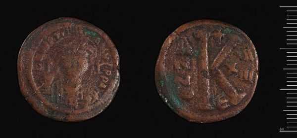 Curator: Here we have a coin of Justinian I, a copper piece held in the collections of the Harvard Art Museums. Its patina suggests a long and complex history. Editor: It’s compelling, isn't it? The verdigris lends the object a sense of temporal depth, almost as if it were exhumed from the very foundations of history. Curator: The coin’s obverse features Justinian, depicted with clear Byzantine imperial regalia, while the reverse showcases a large "M," possibly indicating the coin's value or mint. Editor: Look closely at the coin's reverse; the "M" flanks the inscriptions. How do we decode its significance? It's a symbol of power and fiscal authority, particularly for the Eastern Roman Empire. Curator: Absolutely. The formal arrangement around the "M" and Justinian's iconography on the obverse adhere to a strict imperial visual language. It is all about the semiotics of rule. Editor: And it speaks to how rulers like Justinian used material culture to propagate their authority, connecting the divine right of kings to everyday economic life. It seems such a small object, but its social weight is enormous. Curator: Indeed. The coin, through its design and material, echoes the complexities of power and faith in Justinian's era, a tiny window into a vast empire. Editor: Considering its age, it makes you reflect on how symbols of power persist and evolve, echoing through millennia.