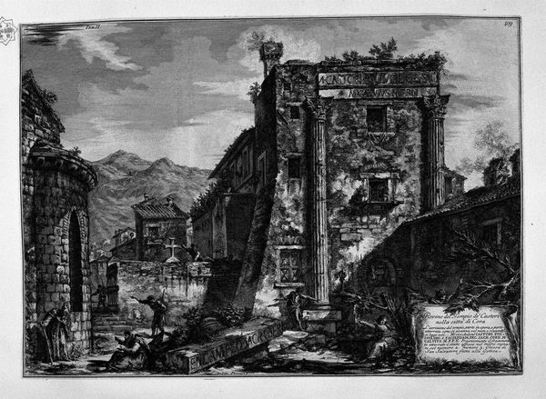 Curator: Piranesi's 1756 etching, "The Roman Antiquities, t. 1, Plate XXXIV. Veduta with Arch of Titus," presents us with a striking vista. What's your initial impression? Editor: Stark. Monumental, of course, but there's a bleakness to it. The shadows are so deep; they nearly devour the details of the stonework. It's more ruin than triumph, it seems. Curator: Indeed. The crumbling architecture speaks to the ravages of time. Look closely at Piranesi’s etching technique; he masterfully uses line and shadow to depict not just the physical structures but also the weight of history pressing down on them. How do you think this detailed depiction contributes to our understanding? Editor: Consider the arch itself: erected to commemorate Titus's victory in the Jewish War. Its imagery – menorahs, spoils of war – are powerful symbols, laden with trauma and conquest that resonates even now. Piranesi captured more than architecture, he captured cultural memory, and its distortions over time. The etchwork reveals an empire built through the consumption and control of labour. Notice, also, the figures that make up the labor for this piece – Piranesi wasn't just interested in the grandeur of the arch, but in representing Rome's relationship to production. Curator: Fascinating points. Let's not overlook how Piranesi utilized printmaking. As a medium, etching is significant here; a fairly reproducible means for wider distribution of Roman ideals across Europe – transforming architecture and triumphal imagery into accessible commodities. The contrast he creates also emphasises a drama through light. Editor: Precisely, those contrasts. I think it's a lament; a visual representation of vanished glories and the shadows of their impact that linger into our modern period. Curator: Agreed. The echoes of history – tangible, unsettling. It forces us to confront what’s lost and the ways our past informs us. Editor: It's a profound work that reminds us to always be mindful of where materials are being sourced.