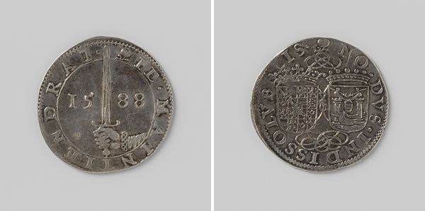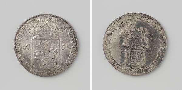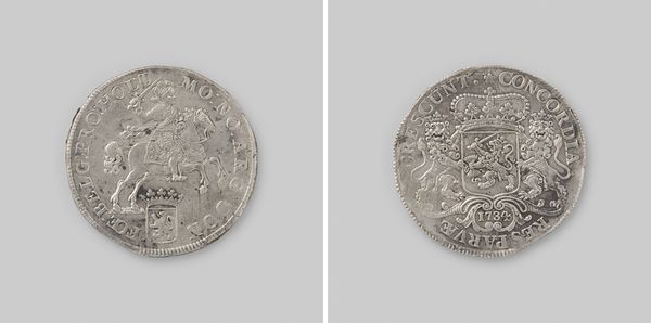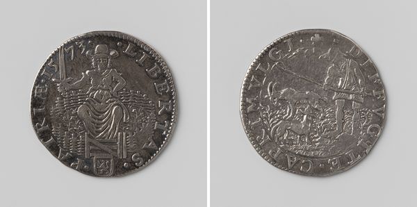 Editor: Here we have a Dutch silver coin, or "Hollandse zilveren rijder," from 1673. It's quite worn, but the images of a horseman and a coat of arms are still visible. I'm struck by how this small object represents such a powerful entity. How do you interpret this work within its historical context? Curator: That's a great starting point. Consider the coin as more than just currency; it's a carefully constructed piece of propaganda, circulating within a specific socio-political landscape. The "ruiter," or horseman, symbolizes power and authority, likely connected to military might or aristocratic status. But let’s think about the *Provincie Holland* profile and what that represents. What were the prevailing social structures and power dynamics at the time this coin was minted? Editor: Well, the Dutch Golden Age was in full swing, right? So, there's immense wealth and power concentrated in the hands of merchants and the ruling elite, and, this piece could then indicate ideas around commercial success, the might of the nation, or its relationship to colonial endeavours at the time. Curator: Exactly. The images depicted on this coin - the horseman, the heraldic symbols - speak to these claims of sovereignty and success. Now, let's think about the language. Look closely at the text inscribed on the coin. It functions as a pronouncement, reinforcing the power of the governing body of that specific location at a time of enormous growth. It’s about the circulation of capital and solidifying political status through everyday exchange. Think about the impact on its carriers. Who do you think would be seeing these images every day, and what message would it send them? Editor: Right, I see what you mean! The coin becomes this tiny ambassador for the powerful, constantly reminding the populace of their place in the social order and in society at the time. Curator: Precisely. And it highlights how even seemingly insignificant objects can play a crucial role in shaping and reinforcing societal hierarchies. This coin is a touchstone that brings historical inequities and social realities into our contemporary considerations of power.