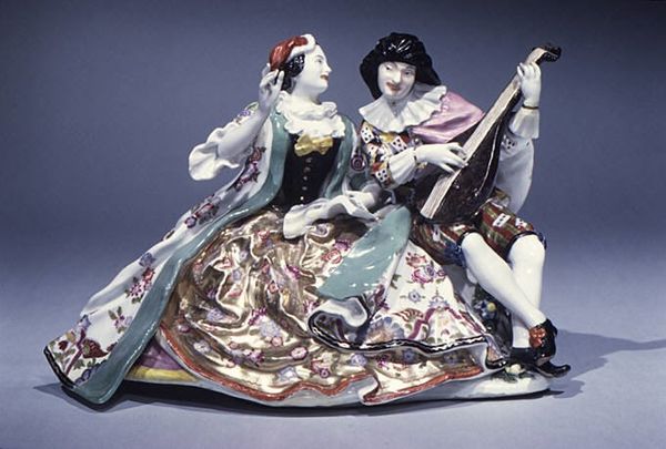 Editor: This is "Marchand de Coeurs," a porcelain sculpture made between 1733 and 1743 by Meissen Manufactory. It feels so intricately crafted and lighthearted. What's your take on it? Curator: What strikes me is the performance of courtship represented here, and the socio-economic context that makes this performance possible. We're not simply looking at a scene of romance, but a tableau vivant of privilege. How might we analyze the gender dynamics at play, given that the women are adorned in finery, while the men seem to be facilitators, serving their desires? Editor: So you're saying there’s a power imbalance depicted, even within this seemingly pleasant scene? Curator: Precisely. The Rococo style often masked these inequalities behind idealized images of leisure and beauty. Consider who this piece was made for – the aristocracy. The sculpture becomes a mirror reflecting their values, and perhaps also, a performance of their perceived benevolence, a kind of theater for self-justification. Where do you see elements of theatricality at play in this piece? Editor: I see it in the posed gestures, the elaborate costumes... It feels like a scene from a play. The title too – "Merchant of Hearts" – implies a transaction, not just romance. Curator: Exactly. It suggests a commodification of affection, and this sculpture, precious and fragile, becomes a commodity itself, a marker of status and wealth, reinforcing existing social hierarchies. This seemingly innocent scene has an underpinning of carefully constructed and maintained social dynamics. What have you gleaned from viewing the art through the lens of critical theory? Editor: It completely changes the way I see it! It’s not just a pretty sculpture anymore; it’s a statement about power and class in 18th-century society. Curator: Precisely. The beauty serves as a point of entry into deeper analysis, one that unravels these hidden structures of power.