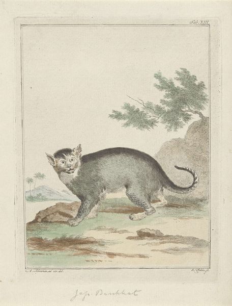 This wood engraving, The Serval, was made by Thomas Bewick, sometime between 1753 and 1828. Look at the way Bewick uses line to render this exotic cat perched on a tree branch. The black ink creates sharp contrasts and textures across the animal's fur and the rough bark, which defines the formal qualities of the print. The Serval's body is covered with tiny, meticulously placed dots, creating a pattern that mimics its spotted coat. This attention to detail is not just descriptive; it speaks to a broader cultural interest in natural history during the Enlightenment. Bewick’s masterful control of the engraving tools allowed him to challenge fixed meanings and engage with new ways of thinking about representation. The visual elements create an accessible image, inviting the viewer to engage with the exotic subject matter. Bewick transforms the animal into a study of light, texture, and form, reflecting the dual role of art as both representation and interpretation.