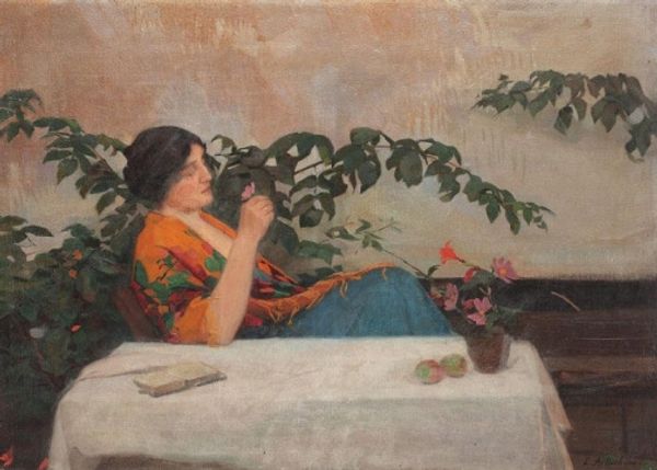 Editor: This is Raimundo de Madrazo’s "Siesta," an oil painting depicting a woman resting in a lush garden setting. I am struck by the contrast between the vivid pink of her dress and the surrounding greenery, giving it such a peaceful vibe. What do you see in this piece? Curator: Oh, absolutely. For me, "Siesta" encapsulates a stolen moment of tranquility, a pause in the hustle. There's this intimate quality; it's almost like we're intruding on her private world. And have you noticed how Madrazo uses light? It’s almost a dappled caress, especially on her dress, giving the painting a beautiful luminosity, that invites you to daydream along with her. Editor: It definitely makes you want to step right in! It’s also interesting how the garden seems both inviting and slightly overgrown. Does that contribute to the feeling of intimacy? Curator: I think it does. The lushness suggests a hidden sanctuary, somewhere separate from the rest of the world. This composition also reveals much about leisure and status in that era, with the implication that leisure was for people of means. Consider also the casual yet elegant dress, she is "caught" in an idyllic world of her own creation. Do you get that impression as well? Editor: Definitely. It's like she's claiming her own space in this quiet retreat, the outside world fading away as we observe this quiet painting. Curator: It truly makes me wonder what she's dreaming of, lost in that moment, almost a little voyeuristic, isn't it? Editor: Absolutely. The more you look, the more secrets seem to surface! Curator: Exactly. And isn’t that the delicious enigma of art?