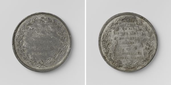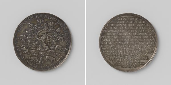 Curator: Before us we have a commemorative medal by Johannes Looff, produced in 1639. It's an engraving on metal, depicting "Slag bij Duins" or, the Battle of the Downs. Editor: The immediate impression is one of dynamic chaos rendered in miniature. The sheer density of detail, the tightly packed ships, it’s almost overwhelming for the eye. Curator: The artwork serves as a visual document of a pivotal moment in the Eighty Years' War, framing it as a decisive victory for the Dutch Republic against the Spanish fleet. It becomes more than just an artwork, it is propaganda meant to reinforce a rising sense of Dutch national identity. Editor: Absolutely, the formal elements contribute to that message. The engraver’s control is stunning, especially when you look at the wave patterns; how the forms are stylized but so expressive. I note that this contributes to an almost symbolic representation of naval power. Curator: Considering that context is key. Beyond the aesthetic, consider who had access to such an object? Medals like this were circulated among the elites to promote specific political viewpoints and affirm allegiances. It helped to solidify popular sentiment towards the Dutch cause. Editor: While appreciating the historical weight, it's hard not to admire the balance achieved within that circular format. See how all these lines, perspectives, create a vibrant scene that is contained, self-referential almost? Curator: And we mustn’t disregard what a battle at sea really meant. Looking at these materials from our contemporary standpoint we have to address slavery, racism and power. We should challenge its status as a celebration of military prowess, looking deeper at the exploitation and violence involved. Editor: Your analysis adds much to it. Seeing it this way adds such complex levels of meaning, highlighting the engraving’s intricate play of light and shadow and prompting to rethink that Baroque movement isn't merely decorative or illustrative, but often politically laden. Curator: It really urges us to examine the intersection between artistic representation and historical realities, in our ongoing understanding of conflicts old and new.