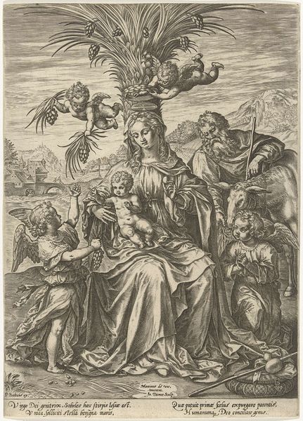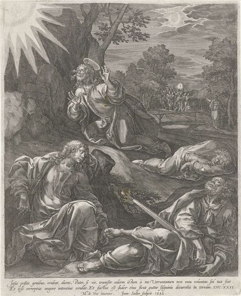 Curator: The work before us, "Christ in the Garden of Gethsemane," was rendered by Dirck Volckertsz Coornhert in 1548. It's currently held at the Rijksmuseum and created via engraving. Immediately, I am struck by how much activity is contained within. What's your initial reading of it? Editor: It looks intensely melancholic, almost claustrophobic, rendered in very fine lines. The scene feels heavy, as though laden with sorrow, and you can see the lines working to delineate form, texture and shadow, building depth from almost nothing. What’s interesting, in the method of its production. Curator: The work portrays Christ's agony the night before his crucifixion. We see him kneeling, an angel offering him a cup symbolizing his fate. Below, the disciples sleep, oblivious. In the distance is a glimpse of the events that will come to pass in his near future. It serves as a visual encapsulation of a pivotal moment in religious history, heavily symbolic. Editor: Absolutely. Consider the technique – engraving requires meticulous labor. Coornhert would have used metal tools to carve these lines into a plate, building up the image bit by bit. This lends itself well to images of moral clarity. Look at the sleeping disciples. I want to explore this contrast in action through manual, reproductive process! It feels extremely relevant to understand this through craft production. Curator: Sleep is frequently used to evoke that moment where the call for help falls to dormancy. Look at how each detail adds to the gravity. The angel appears above, as does the looming execution—the scene laden with premonition. The chalice held by the angel carries powerful symbolic meaning that reverberates even now. Editor: And those materials, the copper plate, the ink… these weren’t just aesthetic choices; they were deeply intertwined with the available technology of the time, informing how the artwork was made and disseminated, and who had access to it. It grounds the religious experience, paradoxically. Curator: The imagery pulls on well-known theological representations that coalesce around grief and redemption. To experience it as a symbol with a reproducible base shifts our understanding of it. Editor: Seeing the material reality helps to reveal those earlier meanings. It is like touching the past. Curator: Indeed. Hopefully, we've provided some insights into the image itself and how an understanding of iconography opens up additional perspectives for considering meaning. Editor: And appreciating the engraving's production and materiality provides a concrete access point to engaging with its historical and social significance.