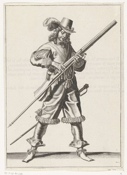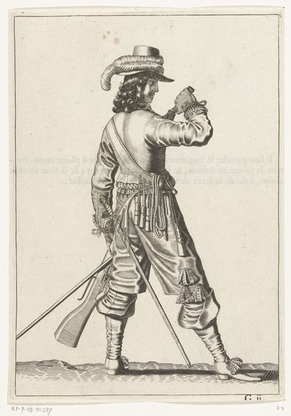 Curator: Let's spend a moment contemplating this engraving from around 1645-1647, titled "Soldaat met een musket die zijn lont overbrengt van zijn rechter- naar zijn linkerhand." The artist is Petrus Rucholle, and the work depicts a soldier with a musket, caught mid-action. Editor: My immediate thought? Precarious! The man’s stance is awkward, his gaze is fixed on something outside the frame and those layers and layers of clothing… not exactly practical battlefield attire. The texture looks almost papery – a tactile ghost of the past. Curator: It's precisely that contrast – the high fashion paired with lethal weaponry – that holds so much symbolic weight. Think about the societal pressures of the era, the performance of masculinity, and the burgeoning military presence in Dutch life. That feathered hat says one thing, the musket something else entirely, no? Editor: Indeed. I'm intrigued by the process behind this engraving. Think about the labour involved— the meticulous transfer of detail, line by line, to the copper plate and then onto paper. Each impression is the result of considerable physical effort, an act of reproductive craftsmanship in its own right. How many impressions were pulled and for what purpose? Curator: That raises vital questions about access and audience. These prints circulated widely, helping shape perceptions of soldiers and warfare. Also, the gesture of transferring the lit match – a small but powerful action – could symbolize vigilance, readiness, or even a willingness to embrace chaos. The match, representing volatility, against a figure presented in meticulous finery: a fascinating paradox! Editor: And the ground, notice the barely etched landscape suggesting how war happens *everywhere*. It has none of the attention to detail afforded to the soldier's outfit; just lines designating somewhere mundane, ordinary. Curator: Absolutely. So, through the soldier’s pose and garb we find ourselves connecting visual and psychological details to this period and a host of cultural considerations beyond a mere military exercise. Editor: Agreed. The engraving makes visible what labour and intent bring forth to our collective historical memory. It compels a richer appreciation of what print media does and allows.