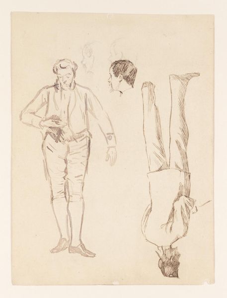 Jean-Louis Forain created this drawing, "To Each His Own," using graphite on paper. It's a quick, economical medium, suited to capturing fleeting moments – a skill Forain honed as a satirical illustrator for Parisian newspapers. The apparent ease of the drawing belies its social critique. Forain uses a few deft lines to depict a tense encounter: a well-dressed man holding a glass, seemingly interrupted by an intimate moment between a woman and another man. The stark contrast between the detailed figures and the sparse background suggests a world reduced to its essentials: desire, possession, and perhaps, betrayal. Forain's choice of graphite allows for subtle gradations of tone, emphasizing the characters' expressions and gestures. The sketch-like quality hints at the immediacy of modern life, where relationships are often transactional and emotions are laid bare. By focusing on the raw reality of human interactions, Forain challenges traditional artistic conventions, offering a glimpse into the complexities of modern morality. This piece reminds us that even the simplest materials can convey profound social commentary, blurring the lines between observation, craft, and art.