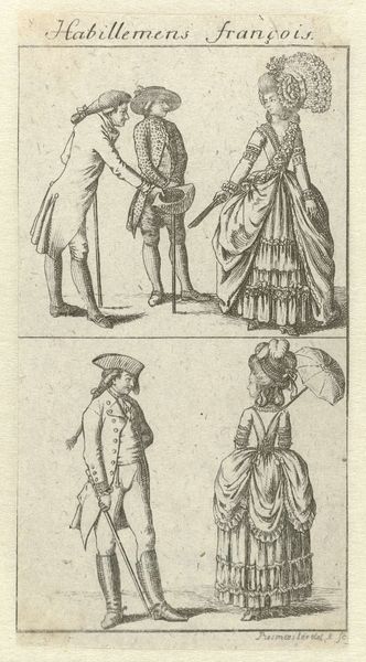 Editor: Here we have Pieter van den Berge’s engraving, "Boer uit Groningen," made before 1713. The figures’ clothes feel strangely exaggerated and their expressions are quite formal. What should we make of this depiction? Curator: This print offers a fascinating window into early 18th century Dutch perceptions of rural identity. The man’s exaggerated clothing – that conical hat, those voluminous breeches – isn’t necessarily a straightforward depiction, but rather a commentary. Think about who was commissioning and consuming these images. Editor: I see. So, you're saying it's not necessarily an accurate portrayal of how farmers actually dressed? Curator: Exactly. Consider how class distinctions were being reinforced and negotiated through visual representation. Was it a satire? Or, were the artists trying to underscore stereotypes of rural folk? Editor: Hmm, that’s really interesting, especially the power dynamic between the artist and his subject. The image, seemingly simple, becomes loaded. The act of looking at this artwork turns into a critique of representation. Curator: Precisely. And don't overlook the woman accompanying him. How might her presence challenge or reinforce those existing stereotypes and social positions? Editor: Good point. It’s easy to focus on the man's attire, but her role is also critical to examine. It also suggests that these images played a role in shaping, rather than simply reflecting, social hierarchies. Thank you for that eye-opening interpretation. Curator: My pleasure! I will walk away reflecting upon it too.