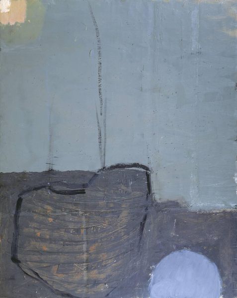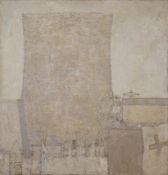 Curator: Prunella Clough's "Man Hosing Metal Fish Boxes" presents a compelling image of labor and industry. The painting is a symphony of muted tones, yet the human figure looms large. What's your first impression? Editor: I’m struck by the sense of alienation, the facelessness of the worker, reduced to a geometric form amidst the industrial landscape. It speaks to the dehumanizing aspects of labor. Curator: Indeed. The metal fish boxes themselves become symbols of mass production, devoid of individuality, mirroring the worker's anonymity. Notice how Clough uses texture to evoke the harshness of the environment. Editor: And consider the hose—a phallic symbol of power and control, yet wielded by someone who seemingly lacks power themselves. There’s a stark commentary on class and the working conditions. Curator: The painting reminds us of the cyclical nature of labor and industry, a constant churning of activity. It suggests that we should look closer to the unsung symbols of everyday existence. Editor: Absolutely. Clough's work prompts us to reconsider the human cost embedded within the objects and systems that define our world, making us look closer to power imbalances.