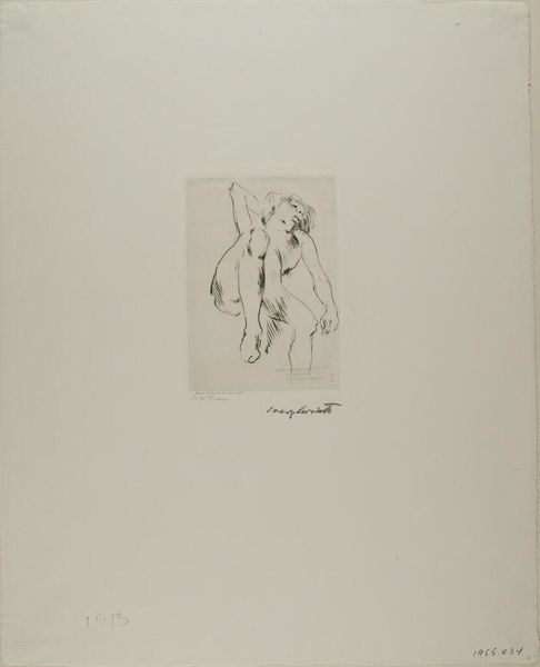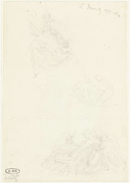 Curator: So, here we have "Legende børn," or "Legend Children," a pencil drawing and etching on paper from 1886 by Lorenz Frølich. Editor: It's faint, almost ethereal. The pale paper and delicate lines give it such a fragile, dreamy quality, doesn’t it? Like a half-remembered tale from childhood. Curator: Absolutely. Frølich was known for his illustrations of Norse mythology and historical scenes. This seems to fall squarely into his genre-painting style, depicting everyday scenes, though the ‘legend’ aspect gives it a deeper twist. Editor: Yes, there is an intimacy suggested in this work through the medium and execution. You feel you’re intruding on a moment, seeing a glimpse of play – children crouched, perhaps building something on the ground. And those blurry lines of trees—it's more an atmosphere than a place. Curator: Agreed. I think that effect of light and suggestion really highlights Frølich's grasp of Romanticism's tenets: emotion and individual experience placed at the center. Editor: It's interesting how he’s avoided strong contours. The softness, lack of precise definition is clearly intentional, dissolving boundaries. It forces you to concentrate—the lack of immediate information is where the picture exists, a challenge to interpretation, a beautiful, light touch of ambiguity! Curator: Perhaps suggesting how memories and stories evolve, blurring over time? The indistinct background might hint at the vastness of legend surrounding their play, suggesting something beyond the immediate scene, something archetypal? Editor: Exactly! The picture is of the viewer just as much as of the viewed! Thanks. Now I think, when you are lost, go back to art. Let that point you in the right direction. Curator: Couldn't have said it better myself. Thanks, this image leaves me full of longing for long ago times!