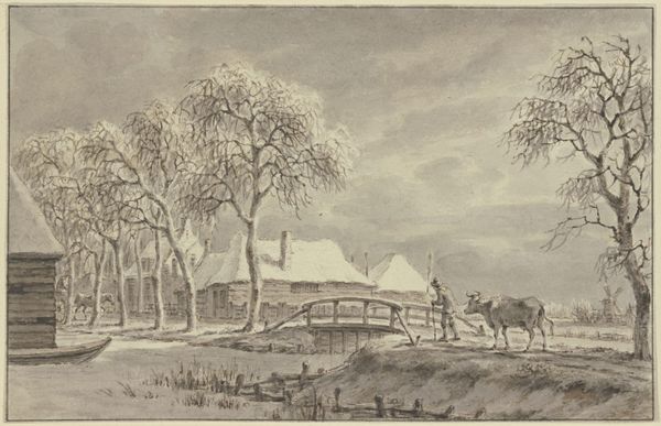 Ferdinand Kobell made this drawing, Farm with Men and Cows, in Germany, sometime in the late 18th century. It depicts an everyday rural scene: farm workers attending to cattle. What’s interesting here is the image’s understated celebration of labor and the natural world. The men aren't romanticized heroes but common workers in a specific place. Germany at this time was still largely agrarian. Thinkers were beginning to question old hierarchies. Landscape art like this can be seen as part of a broader cultural shift toward valuing the lives of ordinary people and their connection to the land. It is a subtle move away from the aristocratic grand manner and more towards the democratic sphere. To understand this drawing better, we might research the economic conditions of 18th-century German agriculture or look at how Enlightenment ideals were influencing artistic tastes. Art is always embedded in its time, reflecting and shaping the values of its society.