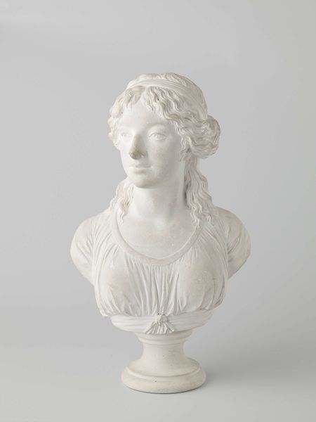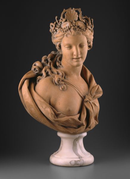 Curator: The "Bust of Amphitrite," dating back to about 1712 and crafted by Anthonie Turck, presents a striking example of neoclassical sculpture rendered in marble. Editor: It's interesting. I'm struck by a sense of guarded melancholy in her expression; almost as though she is aware of her destiny as an object. The texture also creates this effect. It is classical yet so unrefined! Curator: Amphitrite, in Greek mythology, embodies the sea itself. Turck's representation cleverly marries this potent symbolism, with the Neoclassical artistic values of the early 18th century. Think about the visual language that would have immediately resonated at that time. Editor: It’s fascinating how he invokes a kind of hyper-femininity and at the same time silences this feminine power; she is literally cut off at the torso and chest. Consider that during that period in Europe many women lacked agency, confined to restrictive societal roles within a patriarchal power structure. I'm thinking about this power imbalance and the implications for our current moment in history. Curator: Precisely! Amphitrite’s Roman equivalent, Salacia, represents the salty waters. You see artists borrowing from and recasting mythological figures, reshaping narratives with pre-Christian roots in ways that speak to a shifting present and future. The symbols layer on top of each other. The ocean has always been portrayed both as a wellspring of life, and the source of apocalyptic floods that level civilizations. I wonder which one is being conjured in the collective subconscious here. Editor: This bust, while seemingly about mythology, taps into something more profound about feminine presentation. As we observe the interplay between classical forms and its muted execution, and how the historical narrative is presented, perhaps this is calling on us to recognize that art and beauty and meaning can always be found in imperfect situations, just as the sea ebbs and flows, and always carries all life within. Curator: Agreed; the ripples of this interpretation certainly carry on into today. Editor: Absolutely. This could offer insights into both where we come from, and a clearer understanding of where we still need to go in today's culture.