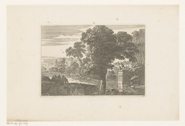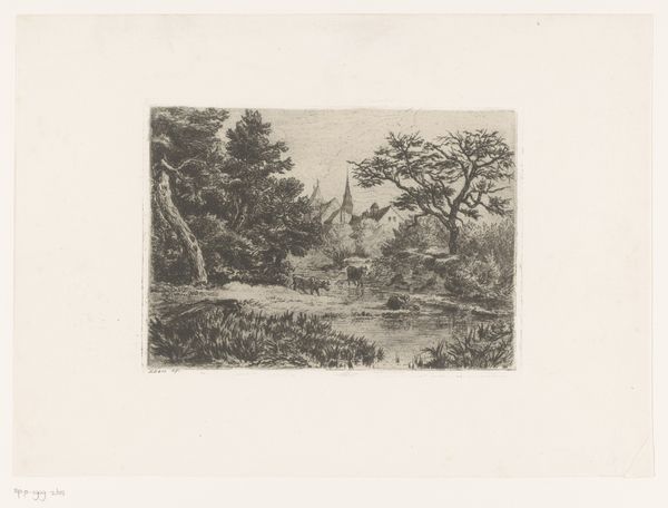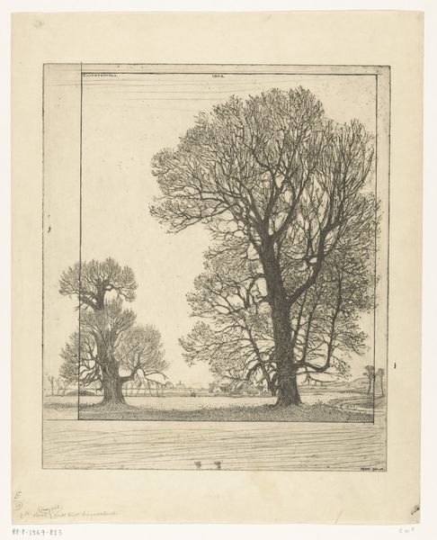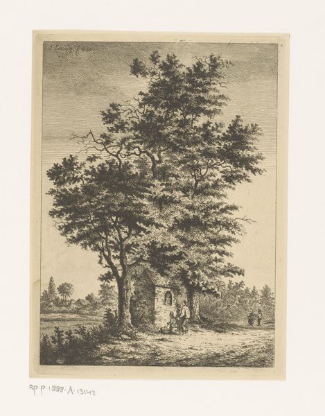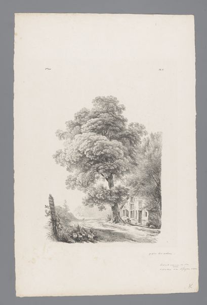 Curator: We’re looking at “Boom naast een woning,” or “Tree next to a house,” a work on paper in ink by Isaac Weissenbruch, created sometime between 1836 and 1912. It resides here at the Rijksmuseum. Editor: My first thought is how the image is both comforting and subtly unsettling. There's a feeling of enclosure, perhaps even slight oppression from the looming tree and house. The linework creates a dense visual texture. Curator: Absolutely. Think of trees throughout history, often representing life and interconnectedness, or the natural world. But here, the imposing presence of the tree next to a building hints at nature's enduring claim even amidst human constructions. There's almost a tension. Editor: I’m interested in that tension, specifically in the contrast between the carefully delineated structure of the building and the more organic, almost chaotic rendering of the tree. See how the lines defining the house are relatively straight and controlled, while the branches and leaves are a wild tangle? The density and placement create a distinct visual rhythm. Curator: The bent trunk of the main tree serves a narrative purpose as well. A tree reaching for something it is far away, might symbolize longing or resilience? We see the evidence of seasons that brought sun, rain, and wind as it bends to thrive. Editor: Good point. The composition directs our eye diagonally, beginning with the sturdy foundation and inclining upward to meet the vast, indeterminate sky. Also, that specific shade of the sky reinforces the tonal variation to build depth and to direct the viewer to that upper area of the image. Curator: And those three birds in the sky above underscore this connection, and suggest aspirations of expansion and release to balance the feeling of confinement the other visual symbols suggest. Editor: Looking at Weissenbruch’s treatment of light and shadow, this work exemplifies his technical abilities to show gradations through mere linework and hatching. I appreciate it so much more by the second. Curator: So it is with symbols, and our evolving recognition of them and how they reflect enduring concerns across time. Editor: A concise breakdown that shows what is special and memorable about a seemingly simple artwork.