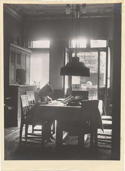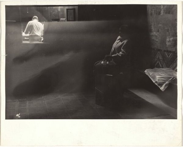 Curator: Here we have Robert Frank’s photograph, "Jack Kerouac," dating from 1959. It’s a black and white image. Editor: It strikes me as intimate. There's Kerouac, caught in a domestic interior, apparently mid-sentence. He is surrounded by plants and seems entirely absorbed. Curator: The means of production are interesting here. Look at the material contrast between Kerouac’s rough, checked shirt and the more bourgeois wallpaper that seems to partially obscure Kerouac typing at his typewriter, hinting at both the accessibility and labor of artistic creation, but its embeddedness within a consumer context. Editor: Absolutely. The plants act like symbolic curtains, framing the writer in a theatrical yet natural tableau. They also symbolize growth, inspiration perhaps? Or the organic process of creativity itself, struggling within and against a stifling context? Kerouac seems framed, in layers. It brings out both his humanity and struggle. Curator: Exactly, think of the process of creation and its connection to place, labor, and value. This wasn't a staged set. This was someone’s home, with domestic labor visible. The labor of making a home alongside the work of creating. A place in the world being built at the same time that worlds within stories are made by typing at the machine in front of him. We see, even the typewriter has materiality and speaks to what technologies of writing are capable of making. Editor: And those floral patterns behind him, and surrounding, recall earlier traditions. You know, Victorian ideals about domesticity and nature brought into the home to remind its occupants about life cycles and connections beyond the industrial and everyday, suggesting that writers must keep connected to these archetypes, to make sure their writing comes alive. Curator: It speaks to the complexities and the lived realities inherent to all art-making. Nothing springs forth fully formed without an entire architecture of material conditions and history. It feels quite raw and documentary in that regard. It gives food for thought on the daily efforts that underlie creativity and cultural movements. Editor: A lasting image, indeed. Curator: Absolutely, a fascinating nexus of culture, class, and production.