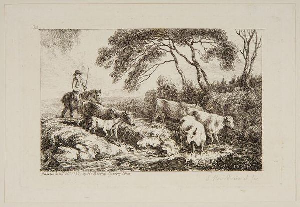 Editor: This etching by Abraham Cooper shows figures with a donkey in a muted landscape. The lines are delicate, and the composition feels very balanced. What catches your eye, looking at it? Curator: Note the economy of line. Cooper uses it to define form and texture. The donkey’s coat, for example, is rendered with short, broken strokes, creating a sense of depth and volume. The formal structure emphasizes a dialogue between stasis and movement, doesn’t it? Editor: It does now that you point it out! It’s interesting how much the lines accomplish. Thanks! Curator: Indeed. The power of the formal elements to convey meaning is noteworthy.