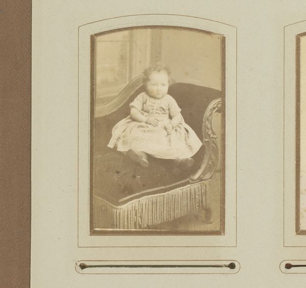 Editor: So, this is “Portret van een meisje in een witte jurk op een stoel op een tafel," or "Portrait of a Girl in a White Dress on a Chair on a Table," from between 1850 and 1900, done with photography by Photographie Artistique. It’s charming, in a wistful sort of way. Something about the sepia tones and her serious little face. What stands out to you in this photograph? Curator: Well, beyond the charm, I am completely sucked into the history in this object. I feel as though I'm gazing into the past... Do you get that feeling too? Look at the composition; the girl perched on a table, a rather theatrical backdrop... it's like a miniature stage. What do you make of that deliberate staging? Editor: It feels posed and constructed, definitely. It makes me wonder about the level of control involved in the photo. Were photographs like this aimed more for accuracy or for beauty and emotion? Curator: It's both, I suspect. Early photography was about capturing reality, but also about emulating painting, aiming for an idealised image. Now, notice how the light falls? Soft, diffused, almost dreamlike. Do you think that adds to that wistful mood you mentioned earlier? Or would it just be what they could achieve with that process back then? Editor: It certainly adds something ephemeral, like a memory. The warmth is nice, but I was immediately drawn to her expression. Her expression is almost, I don't know, modern somehow. It doesn't feel sentimental. Curator: I agree, she possesses such a captivating and genuine presence in front of the camera. It feels like looking into the eyes of the past… it shows the power of a single moment, even after over a century. So much personality caught. Editor: Exactly! It really stuck with me. It reminds me to always try to pause, observe and reflect, you know?