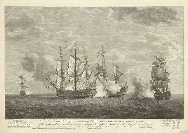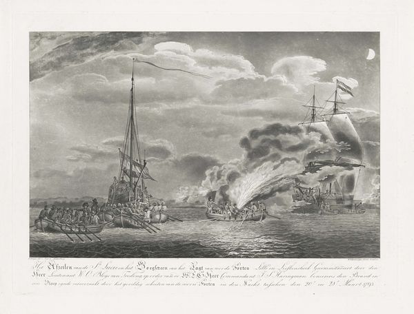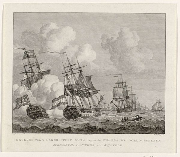 Curator: This is a fascinating historical print titled "Afslaan van de aanval op de twee kanonneerboten, 1831," created in 1831. It's an engraving, likely on paper. Editor: My first thought is of how dramatic it is, all sharp lines and contrasting tones to depict a rather chaotic scene. I see two ships battling in choppy water. Curator: Right. This work depicts the repelling of an attack by the Belgians on two Dutch gunboats. Think about the materiality of this image: an engraving intended for mass consumption, depicting a moment of Dutch victory during a time of national upheaval and tension in the years that would follow the Belgium Revolution. How does it communicate that purpose to a wide viewership? Editor: The visual language of printmaking really lends itself to heroic narratives like this. The medium itself – being reproducible – turns the event into something iconic and widely distributed. You get that clear sense of, “we were here; this is how it happened". The focus on labour also emerges, not just in what is depicted in terms of human struggle but in the skilled execution of the work in printmaking. I imagine it demanded precise labour for what was likely supposed to be rapid distribution and consumption. Curator: Exactly. The choice of depicting this specific moment—a "repelling" of an attack—speaks to the complexities of national identity and historical narrative. In 1831, the memory of previous clashes and future anxieties likely influenced the artist's composition and the public's interpretation of the work. We have to read through that lens, don’t you think? Who is this artwork serving in representing and reinforcing that dominant discourse? Editor: Absolutely, and I can see it doing that in several ways. Take the ships themselves; their wooden construction and rigging speaks volumes about maritime strength and dominance as materials and the image then works in tandem to strengthen notions of power and industry in Dutch history. I hadn't initially made that connection. It gives me more insight into this image. Curator: Indeed. When we consider this image alongside the political context, questions emerge about the intended message. The artist clearly makes conscious decisions. Even though we don't know their name, their message is clear and directed to the intended Dutch audiences of that time. It's a testament to how even ostensibly 'realistic' depictions are, in essence, carefully constructed narratives. Editor: It has been interesting to see the work behind it: materials and craft to further this idea of the nation and heroism.
